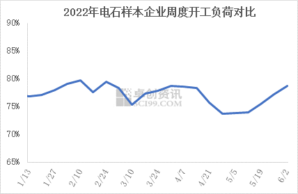 本周电石平均开工负荷提升,截至本周四,预估电石行业周度平均开工负荷率在78.7%,环比上周上涨1.53个百分点。